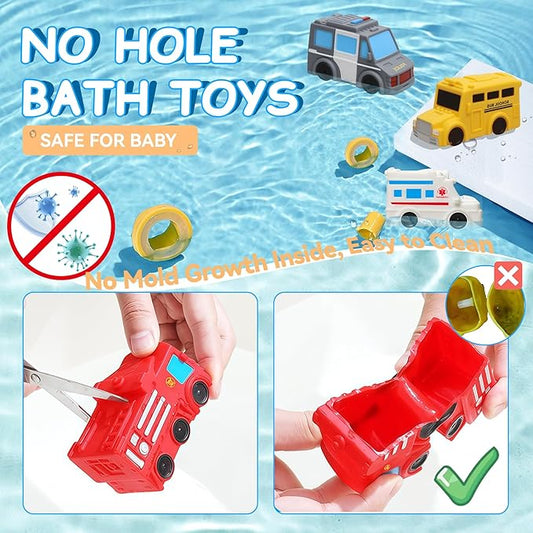 Mold Free Bath Toys, 6 Packs No Hole Baby & Toddler Bathtub Toys: Water Floating Vehicles Truck School Bus Car Toy, Sealed Soft Silicone Rubber Bath Toys for Kids ages 0+ (with Mesh Storage Organizer)