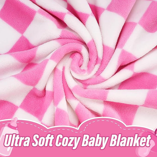 Plush Checkered Baby Blanket for Boys Girls Nursery, 30"*40" Warm Short Fleece Blanket Neutral for Infant Newborn, Small Fuzzy for Sleeping, Chenille Baby for Stroller (Pink&White)