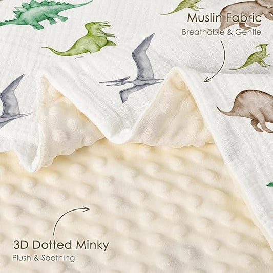 Dinosaur Baby Blankets for Boys, Newborn, Soft Nursery Minky Blankets with Muslin and Dotted Fleece Back 30x40 inches, Receiving Bed Quilt for Infants, Toddlers