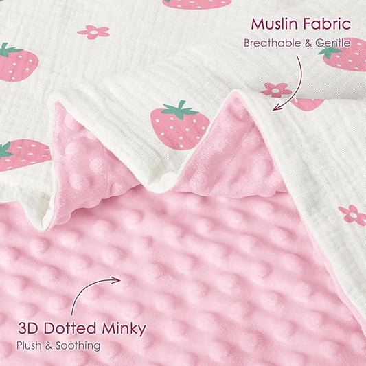 Strawberry Baby Blankets for Girls, Soft Nursery Minky Blankets with Muslin and Dotted Fleece Back 30x40 inches, Receiving Bed Quilt for Newborn, Infants, Toddlers