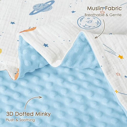 Outer Space Baby Blankets for Boys, Soft Nursery Minky Blankets with Muslin and Dotted Fleece Back 30x40 inches, Receiving Bed Quilt for Newborn, Infants, Toddlers