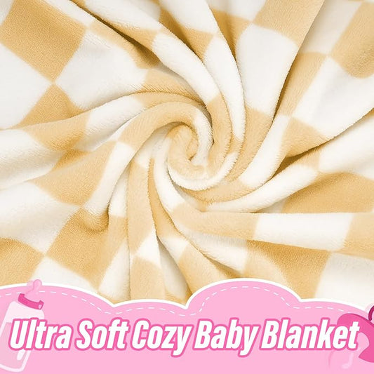 Plush Checkered Baby Blanket for Boys Girls Nursery, 30"*40" Warm Short Fleece Blanket Neutral for Infant Newborn, Small Fuzzy for Sleeping, Chenille or Stroller (Sand Yellow&White)