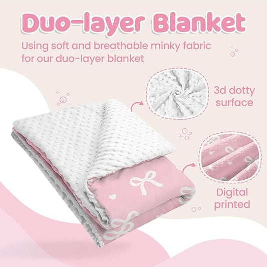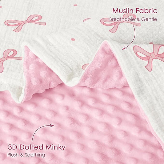 Bow Baby Blankets for Girls, Soft Nursery Minky Blankets with Muslin and Dotted Fleece Back 30x40 inches, Receiving Bed Quilt for Newborn, Infants, Toddlers