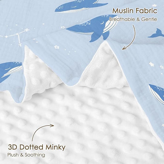 Whale Baby Blankets for Boys Girls, Soft Nursery Minky Blankets with Muslin and Dotted Fleece Back 30x40 inches, Receiving Bed Quilt for Newborn, Infants, Toddlers