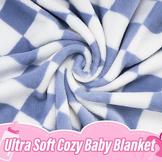 Plush Checkered Baby Blanket for Boys Girls Nursery, 30"*41" Warm Short Fleece Blanket Neutral for Infant Newborn, Small Fuzzy for Sleeping, Chenille or Stroller (Dark Blue&White)