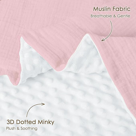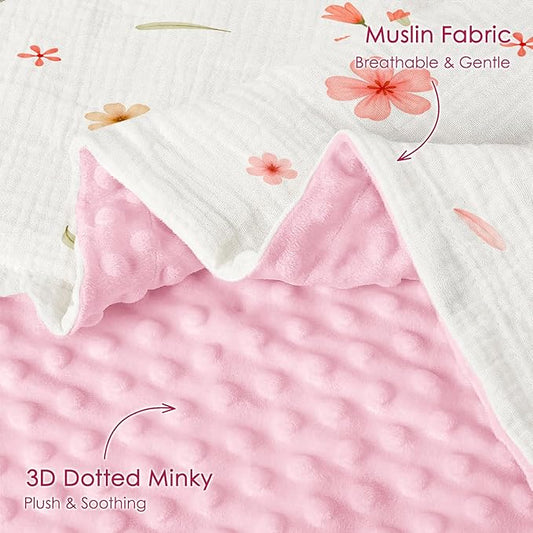 Baby Blankets for Girls, Soft Nursery Minky Blankets with Muslin and Dotted Fleece Back 30x40 inches, Receiving Bed Quilt for Newborn, Infants, Toddlers (Pink)
