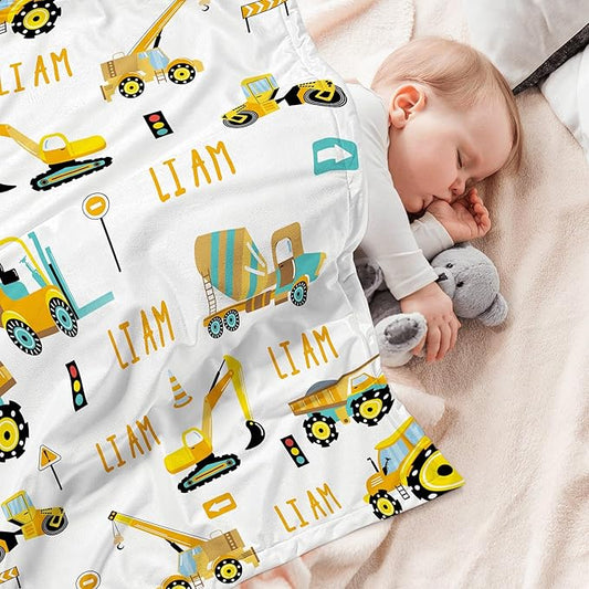 Personalized Truck Excavator Blanket with Name Cutsom Blanket for Baby Boy Car Lover Toddler Kids Customized Gifts for Baby Shower Christmas Birthday Newborn Gifts