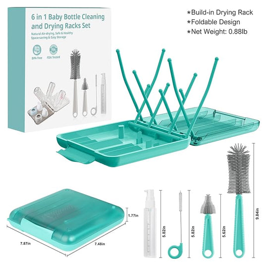 Bottle Brush Set -Baby Travel Essential-6 in 1 Bottle Cleaner Kit with Silicone Bottle Brush,Nipple Cleaner Brush,Straw Brush,Soap Dispenser,Storage Box,Bottle Drying Rack for Home and Travel(Green)