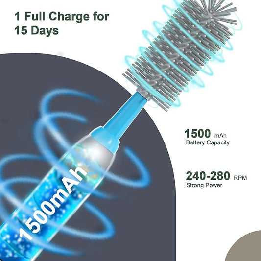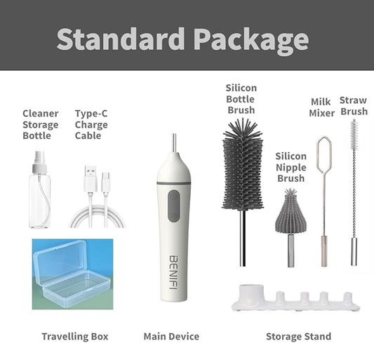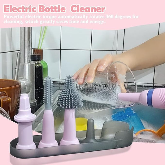 Travelling Electric Bottle Brush Cleaner, Baby Bottle Brush Set, Fully Water -Proof Bottle Brush, Long Handle Brush, BPA Free Silicon Brush Heads, Drying Stand, Milk Mixer, Egg Whisk Included