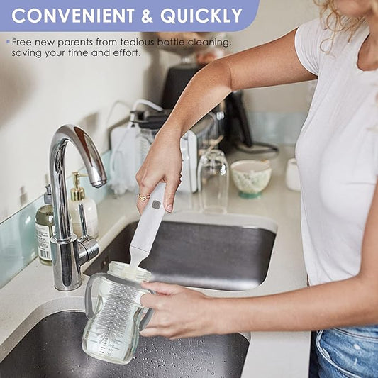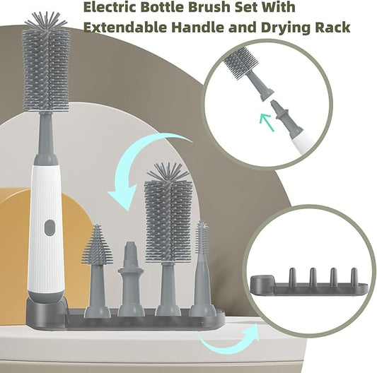 Electric Baby Bottle Brush Cleaner with Extended Handle & Drying Holder, Baby Bottle Brush Set with Silicone Bottle/Nipple/Crevice/Brush,Straw Cleaner,Lifesaver Automatic Bottle Cleaner,Gray