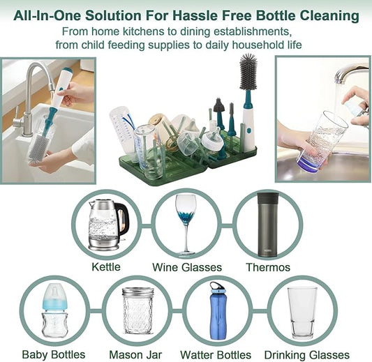 Portable Electric Bottle Brush Cleaner and Drying Rack Set, Foldable Bottle Drying Rack with 16 Ribs, Automatic Bottle Cleaner Brush Help Thorough Cleaning of Baby Bottles and Breast Pumps,Green