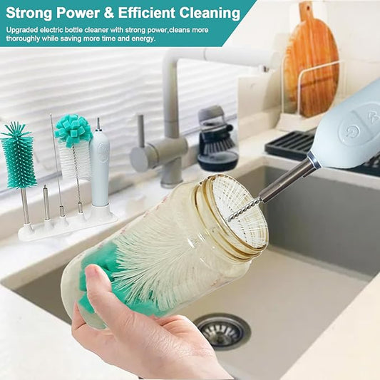 Electric Baby Bottle Brush Cleaner with Extended Handle & Drying Holder, Baby Bottle Brush Set with Silicone Bottle/Nipple/Crevice/Brush,Straw Cleaner,Lifesaver Automatic Bottle Cleaner,Green