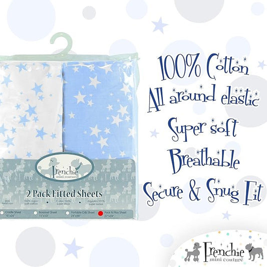 Fitted Pack n Play Sheets,100% Cotton Standard Mattress, Blue Stars, 27 x 39in, 2-Pack