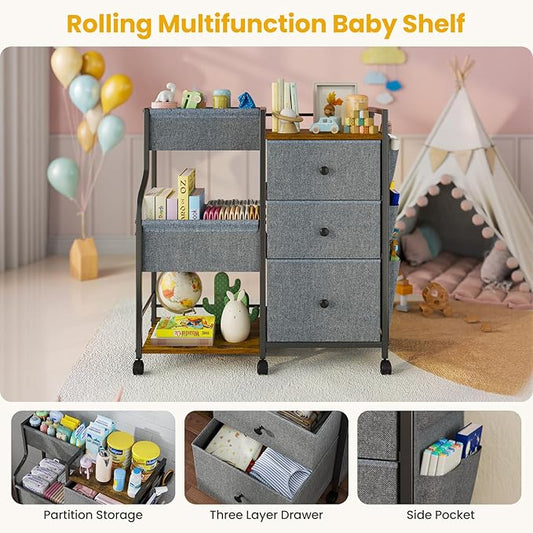 Baby Diaper Caddy, 3 Tier Baby Organizer and Storage Cart with Dividers and Drawers, Mobile Utility Rolling Cart, Newborn Baby Essentials Storage Cart with Wheels for Nursery, Bedroom, Grey