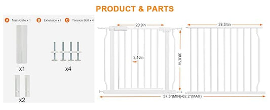 Extra Wide Baby Gate Extra Tall Dog Gate for Stairs Doorways White Metal Tension Child Pet Safety Gates with Pressure Mount 57.5-62 Inch