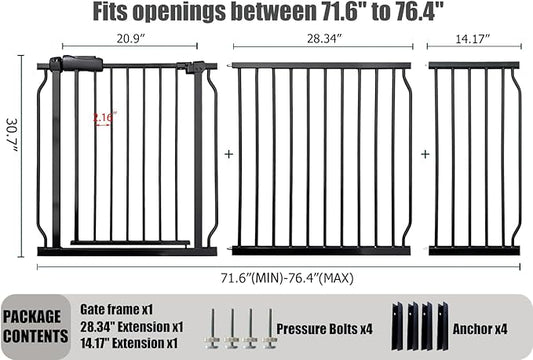 Extra Wide Baby Gates - 71.6-76.4 Inch, Black Metal Pressure Mounted Child & Pet Gates for Stairs & Doorways