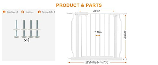 HOOEN Narrow Baby Gate for Stairs - 29 to 34 Inch Wide with Door, Metal Tension Pressure Mounted Child Safety Gate