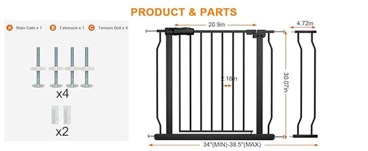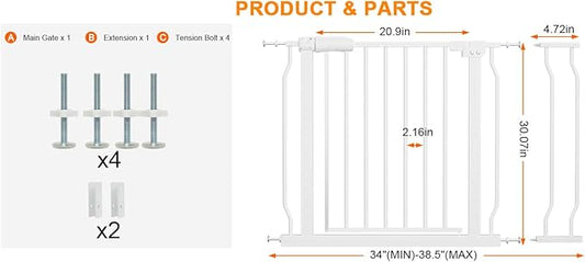 Wide Baby Gate for Stairs Doorways 30" Tall 34 to 38.5 Inch Wide Pressure Mounted Baby Gate Walk Through Child Gates for Kids or Pets Indoor Safety Gates