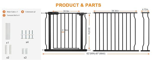 Walk Through Baby Gates Extra Wide for Stairs Doorways Auto Close Tension Black Metal Child Pet Safety Gates with Pressure Mount 62-67 Inch