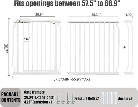 Extra Wide Baby Gate - 62-67 Inch Tension Mounted Safety Child & Pet Gate - White Metal - Walk Through - Long - for House Doorways & Stairs
