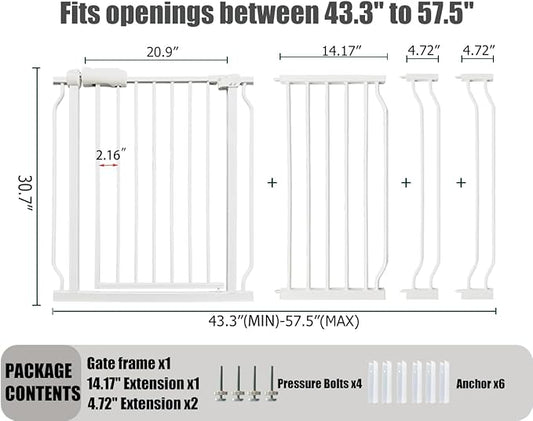 Extra Wide Baby Gate, 52.7-57.5 Inch, Large Walk Through, White Metal, Pressure Mounted, Long Safety Dog Gate for House Doorways & Stairs, 30 Inch Tall