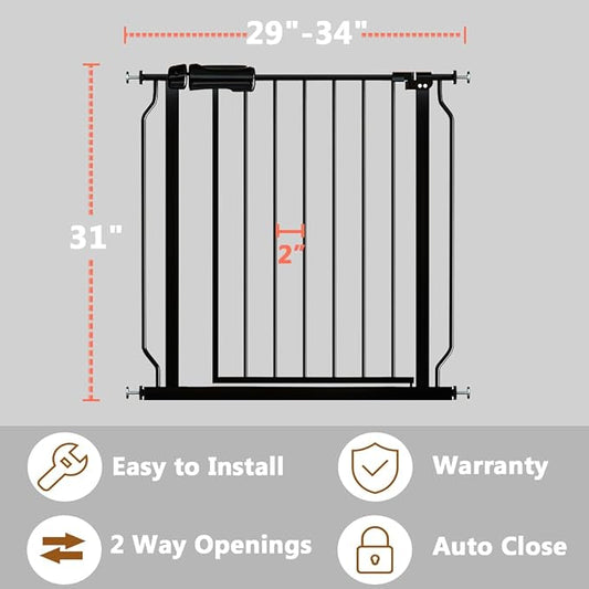 Fairy Baby Walk Through Black Baby Gate 29-34 Inch Wide, Pressure Mounted Safety Gate with Door No Drill, Tension Metal Gate for Dog and Toddler