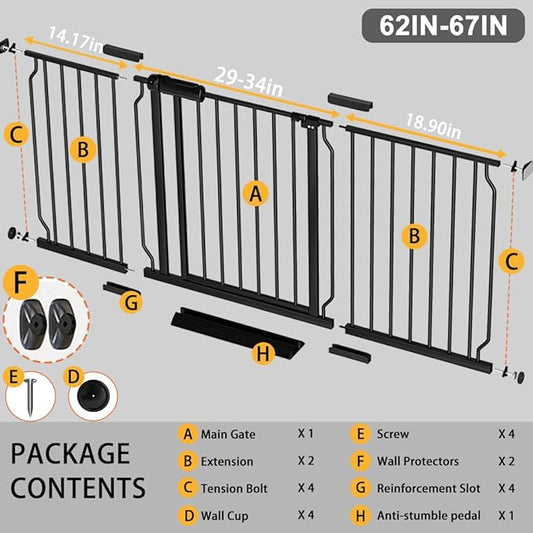 Fairy Baby Extra Wide Baby Gate Black 62-67 Inch Wide, Walk Through Pressure Mounted No Drill, Long and Large Tension Gate for Pet and Kids