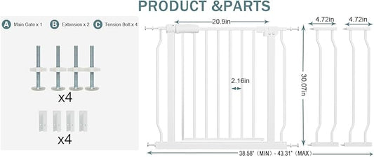 38-43 Inch Wide Baby Gate for Stairs Indoor Safety Gate for Toddlers Kids Pressure Mounted Dog Gates for The House Doorways Pet Gate Walk Through Metal Gates(White, 38.58"-43.31"/98-110CM)