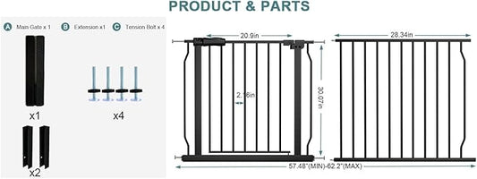 Extra Wide Baby Gate Extra Tall Tension Indoor Safety Gates Black Metal Large Pressure Mount Pet Gate Walk Through Safety Dog Gate for The House Doorways Stairs (57.48"-62.2"/146-158CM, Black)