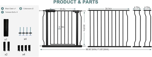 Extra Wide Baby Gate Tension Indoor Safety Gates Black Metal Large Pressure Mounted Pet Gate Walk Through Long Safety Dog Gate for The House Doorways Stairs (66.93"-71.65"/170-182CM, Black)