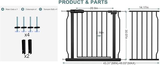 WAOWAO Baby Gate 43.31-48.03" Extra Wide Pressure Mounted Walk Through Swing Auto Close Safety Black Metal Toddler Kids Child Dog Pet Puppy for Stairs,Doorways,Kitchen