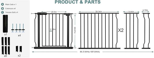Extra Wide Baby Dog Gates for Doorways Tension Indoor Safety Gates Black Metal Large Pressure Mounted Pet Gate Walk Through Dog Gate for The House Stairs (Black, 86.3"-105"/219-267CM)