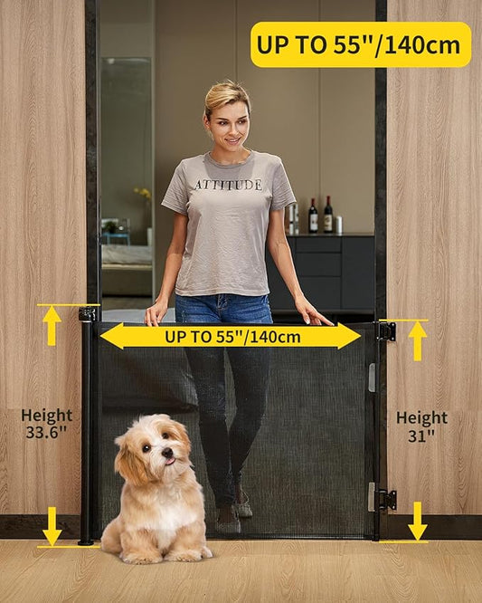 Retractable Baby Gate for Stairs – 33” Height, Expands up to 55” Width – Safety Gate for Infants, Toddlers, Dogs & Pets – Easy Install, Secure Closure, Black Mesh Design for Indoor & Outdoor Use
