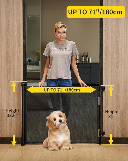 Retractable Baby Gate for Stairs – 33” Height, Expands up to 71” Width – Safety Gate for Infants, Toddlers, Dogs & Pets – Easy Install, Secure Closure, White Mesh Design for Indoor & Outdoor Use