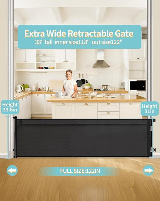 Retractable Baby Gate for Stairs – 33.6” Height, Expands up to 118” Width – Safety Gate for Infants, Toddlers, Dogs & Pets – Easy Install, Secure Closure, Black Mesh Design for Indoor & Outdoor Use