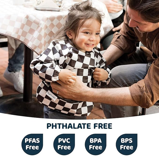 Tiny Twinkle Mess Proof Baby Bib,Waterproof Smock Baby Bib for Eating,Machine Washable Long Sleeve Bib,Baby Led Weaning,Toddler Bib,BLW Supplies(Checkers Black, Large 2-4 Years)