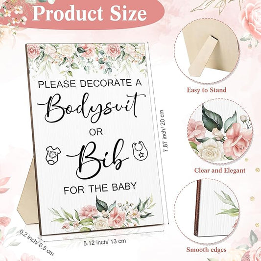 Roowest 35 Pcs Baby Shower Bibs Games Design Wooden Baby Shower Party Game Sign DIY Bodysuit Sign 15 White Blank Feeder Bibs 9 Newborn Bodysuit 10 Markers for Boys Girls(Flower)