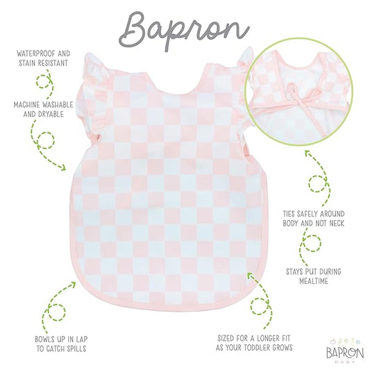 BapronBaby Pink Flutter Checkerboard Bapron - No Neck Tie Safer Bib for Baby & Toddler - Soft Waterproof Stain Resistant - Machine Washable - Sz Preschool 3-5yrs