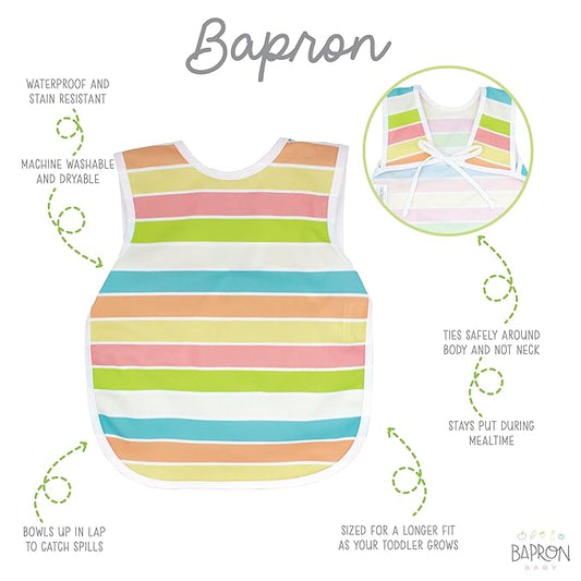 BapronBaby Rainbow Stripes Bapron - No Neck Tie Safer Bib for Baby & Toddler - Soft Waterproof Stain Resistant - Machine Washable - Sz Baby/Toddler 6m-3T