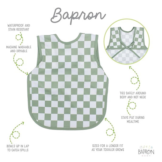 BapronBaby Sage Checkerboard Bapron - No Neck Tie Safer Bib for Baby & Toddler - Soft Waterproof Stain Resistant - Machine Washable - Sz Baby/Toddler 6m-3T
