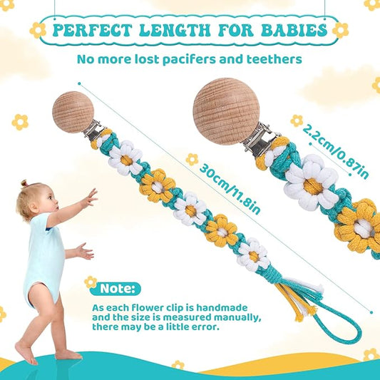 Pacifier Clip for Boys Girls Floral Daisy Macrame Baby Paci Clip Pacifier Holder Leash Boho Wooden Clips Handmade Braided Cotton Binky Clips (1pack:Caramel Style B)