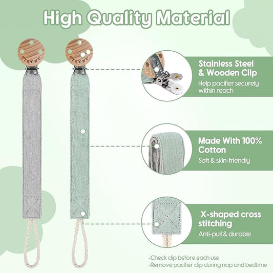 Baby Pacifier Clip, 2 Pack Fabric Pacifier Clips, Super Soft Fabric Strap with Wooden Clip, Pacifier Clips for Baby Girl & Boy (Cream/Sage)
