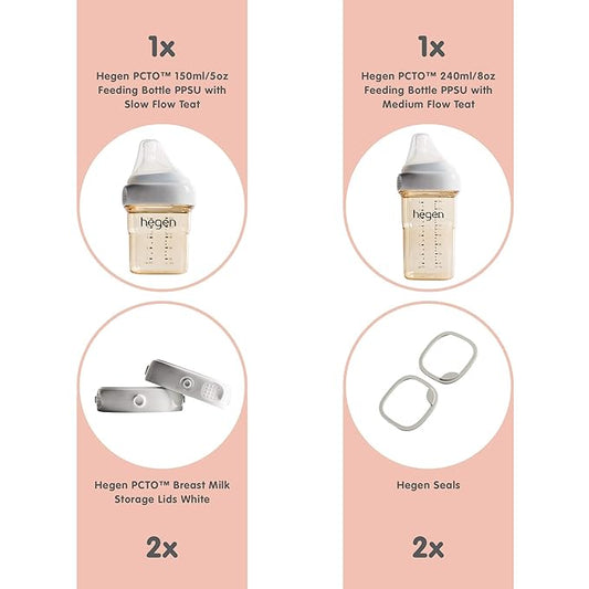 hegen Newborn Baby Bottle Basic Starter Kit- PPSU Bottle for Babies, Medium & Slow Teat- Breast Milk Storage Lids and Secure Seals