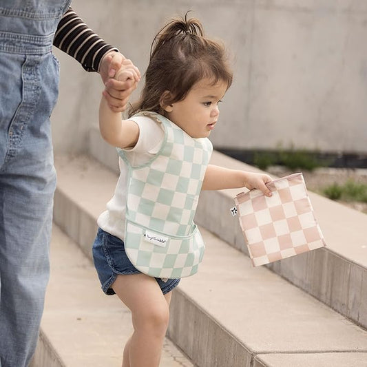 Tiny Twinkle Mess Proof Baby Bib - Waterproof & Lightweight Baby-Led Weaning Apron | 100% Recycled Polyester, Easy Clean & Machine Washable (Green Checkers, Large 2-4 Years)