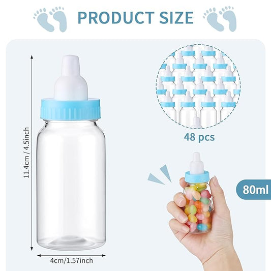 48 Pcs 4.5 Inch Baby Bottle Shower Favor Mini Plastic Candy Bottle Baby Shower Fillable Feeding Candy Box for Party Boy Girl Birthday Newborn Baptism with Removable Blue Tops