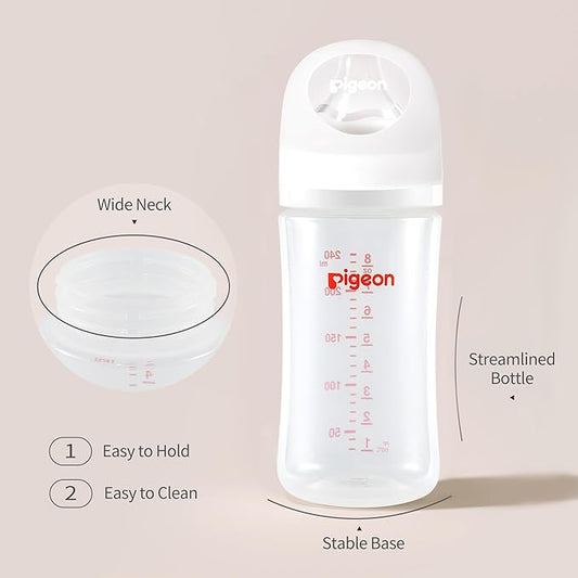 Pigeon PP Nursing Bottle Wide Neck, Anti-Colic, Streamlined Body, Natural Feel, Easy to Clean, 8.1 Oz(Pack of 4), Includes 4pcs M Nipples (3m+)