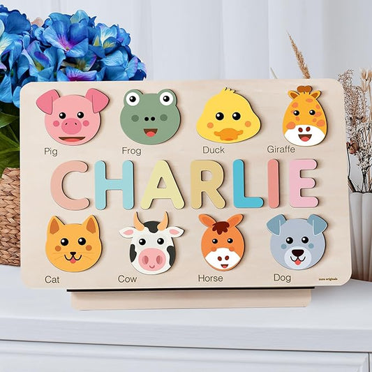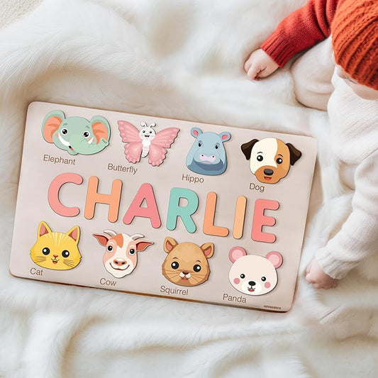 Custom Baby Name Puzzle with Animals, Baby Girl and Boy Gift, Personalized Puzzles for Toddlers, 3 6 9 12 15 18 24 36 Months Toy, Custom Baby Gift, Boy and Girl Personalized Wood Toy, Christmas Gift