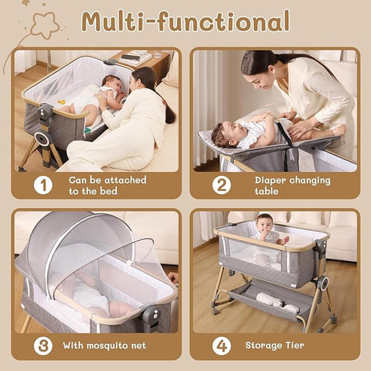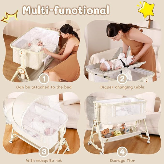 Baby Bassinet 5 in 1,Baby Bedside Bassinet with Diaper Table, Mosquito Net, Mattress, Storage Layer, Can Be Stored in One Button Travel Crib (Beige)
