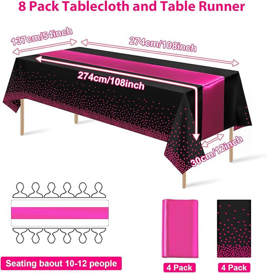 8Pack Disposable Plastic Party Tablecloths and Satin Table Runner Set Black Hot Pink Dot Table Cloth Hot Pink Satin Table Runner for Wedding Birthday Baby Shower Anniversary Holiday Party Decorations