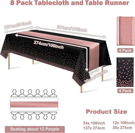 8Pack Disposable Plastic Tablecloths and Satin Table Runner Set Black and Rose Gold Dot Tablecloth Gold Satin Table Runner for Wedding Birthday Baby Shower Anniversary Christmas New Year Party Supply